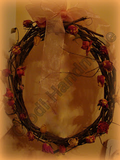 Cred ca sunt o multime de persoane care usuca trandafirii si ii pastreaza in vaza. Si mie imi place sa usuc florile primite. Trandafirii pe care i-am folosit la coronita s-au uscat singuri in vaza dupa ce am uitat sa le schimb apa :) Chiar si asa, s-au dovedit a fi utili. Dupa uscare am legat fiecare floare cu sarma subtire de o coronita de crengi.